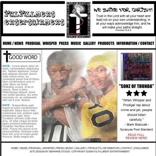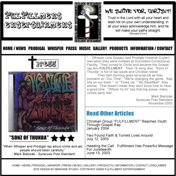 CrossFire Records was orchestrated and inspired by God. The vision was given to Whisper, while being incarcerated at Groveland Correctional Facility. Upon release, Whisper was a member of Fulfillment Entertainment, a Gospel Rap Duo, consisting of Prodigal and Whisper. The two of them released their debut album Sonz of Thunda, which was a big success for the Gospel Rappers and an eye opener for the people.